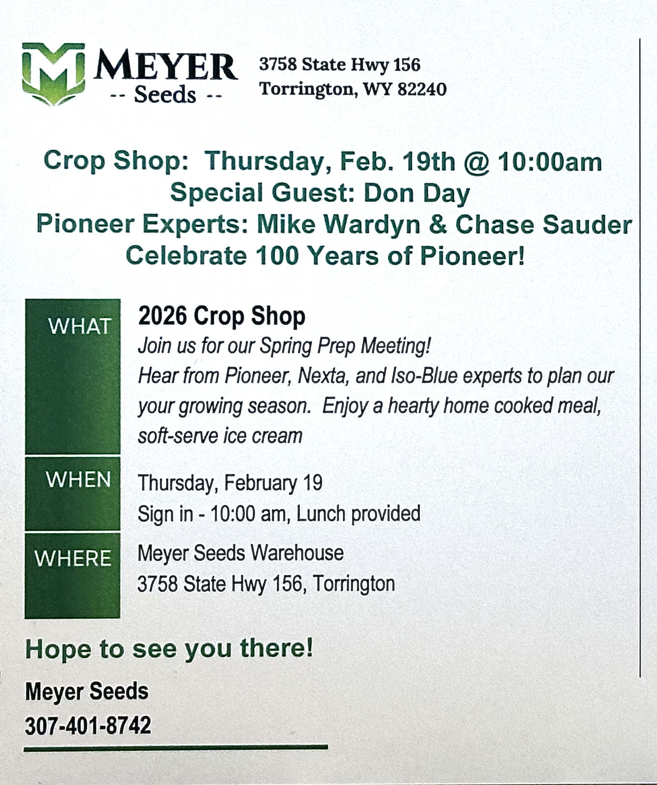 We’re celebrating a century of ag innovation throughout 2026, and that includes the Golden Ticket Giveaway. If your bag of seed corn is treated in gold, you’ll win the trip of a lifetime: an immersive seed journey experience that includes stops at Pioneer facilities in Iowa and Hawaii in January 2027. Will one of the winning seed bags come from Meyer Seeds? We have no idea – but we’re excited to find out! Start planning for next season now.